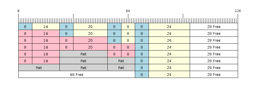 Referring to the diagram above, the 18, 3, and 27 byte items are rounded up to 20, 4, and 28 bytes respectively. An 8 byte header is then added in front of each item.