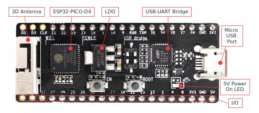 - USB interface. It functions as the power supply for the board and the communication interface between PC and ESP32-PICO-KIT.
