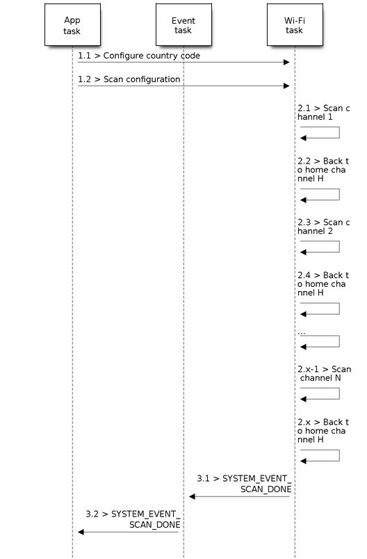 Upon receiving this event, the event task does nothing. The application event callback needs to call esp_wifi_scan_get_ap_num() and esp_wifi_scan_get_ap_records() to fetch the scanned AP list and trigger the Wi-Fi driver to free the internal memory which is allocated during the scan (do not forget to do this)! Refer to ‘ESP32 Wi-Fi Scan’ for a more detailed description.