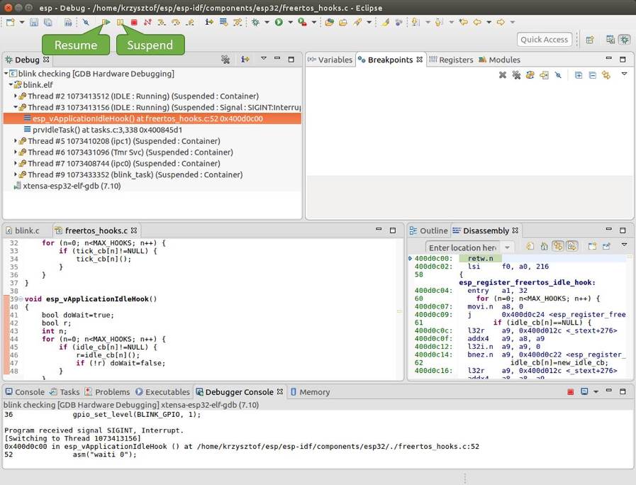 In particular case above, the application has been halted in line 52 of code in file freertos_hooks.c Now you can resume it again by pressing “Resume” button or do some debugging as discussed below.