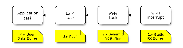 • The Wi-Fi driver delivers the packet to the upper-layer (LwIP), and allocates a PBUF for holding the “Dynamic Rx Buffer”.