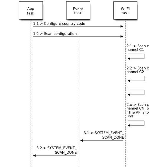 Upon receiving this event, the event task does nothing. The application event callback needs to call esp_wifi_scan_get_ap_num() and esp_wifi_scan_get_ap_records() to fetch the scanned AP list and trigger the Wi-Fi driver to free the internal memory which is allocated during the scan (do not forget to do this)! Refer to ‘ESP32 Wi-Fi Scan’ for a more detailed description.